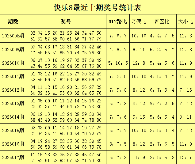 福彩快乐8第2026017期开奖回顾:11 15 28 33 36 37 38 46 47 50 51 52 61 62 63 67 68 71 73 80,其中奖号012路比为5:7:8,四区比为2:5:5:8奇偶比为11:9,大小比为13:7。