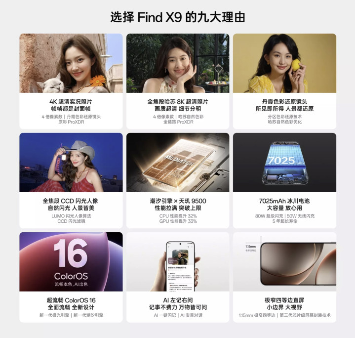 作为中杯影像旗舰,OPPO Find X9的外围配置也很出彩:比如新一代山海通信,好用的AI一键闪记,多焦段人像闪光灯和新一代无影抓拍等等,最高支持6X无损变焦功能。在预算允许的情况下,OPPO Find X9才是最全能的中屏旗舰手机,12GB+256GB版国补价3598元,16GB+512GB版国补价4498元,预算允许的话可以闭眼入。