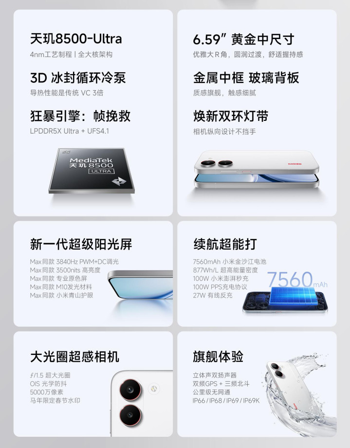 该机搭载天玑8500处理器,适合王者荣耀与和平精英等中轻负载游戏用户,12GB+256GB版国补价仅为1699元。该机的续航组合是7560毫安时和100W+27W闪充,还有金属中框和双面玻璃质感机身,整机通过了IP68、IP69和IP69K满级防水认证,并且仅有8.18毫米和204克。该机采用6.59英寸超级阳光护眼屏,后置5000万OIS双摄组合,内置立体双扬和X轴马达,支持红外遥控、多功能NFC、双频GPS和三频北斗定位等等。