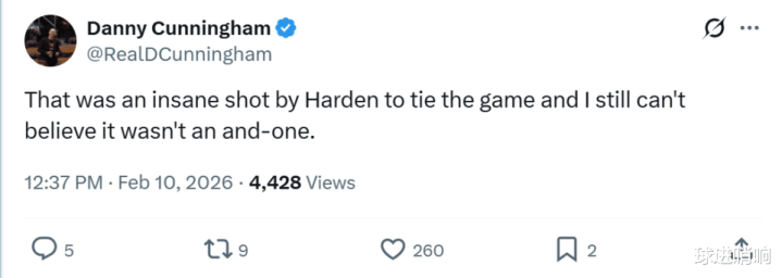 骑士记者Danny Cunningham也感叹到:“哈登这一记扳平比分的三分真的是不可思议,我现在还不敢相信这球竟然不是3+1。”