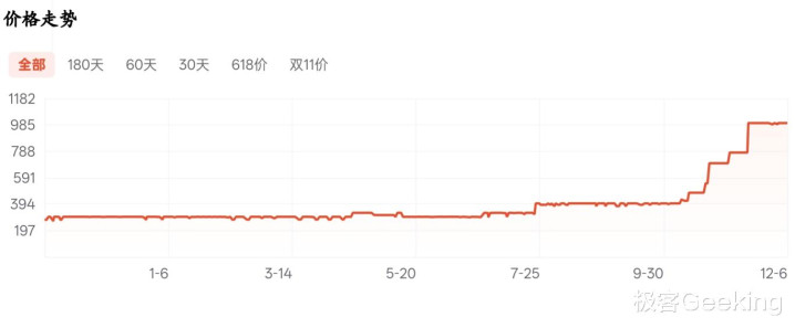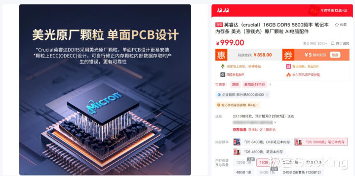再如内存条产品,英睿达 DDR5 5600MHz 16GB 笔记本内存,今年 9 月售价 399 元,目前已经涨到了 999 元,翻了一倍还多。其他比如三星等品牌的 SSD 和内存产品的涨价态势也与此类似。