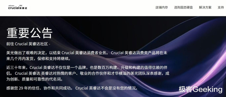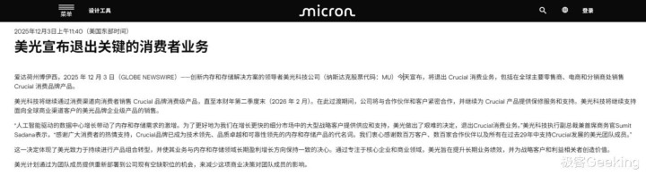 事情如此突然,没有预热和爆料,也没有小道消息,12 月 4 日,存储巨头美光(Micron)一纸官方公告,宣布在全球范围将退出消费者市场,也就是旗下的消费级品牌英睿达(Crucial)未来不再销售任何 DRAM 内存和 SSD 存储产品,计划在 2026 年 2 月底前彻底关停英睿达品牌,美光称这是一个“艰难的决定”。