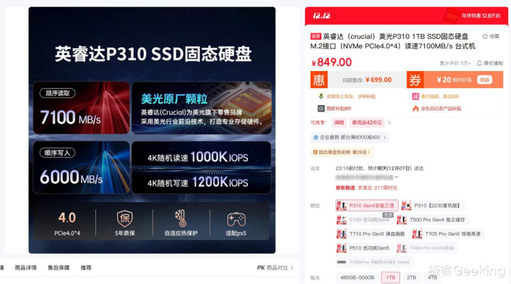 比如英睿达的P310 1TB M.2 固态硬盘,一款经典的 NVMe PCI-E 4.0 产品,今年 9 月的价格为 469 元,而现在已经飞涨到了 849 元。